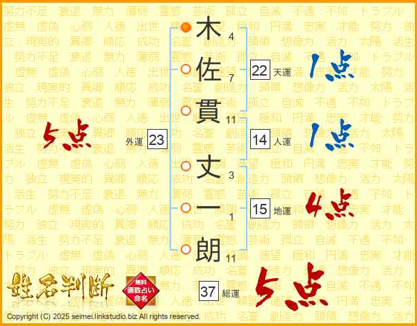 木(4画)佐(7画)貫(11画) 丈(3画)一(1画)朗(11画)