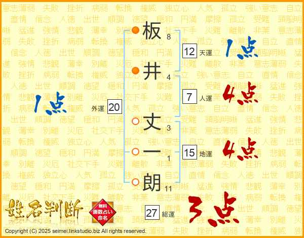 板(8画)井(4画) 丈(3画)一(1画)朗(11画)