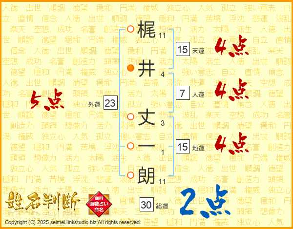 梶(11画)井(4画) 丈(3画)一(1画)朗(11画)