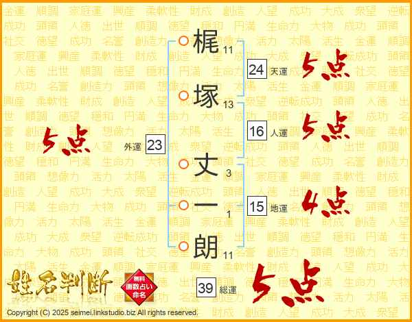 梶(11画)塚(13画) 丈(3画)一(1画)朗(11画)