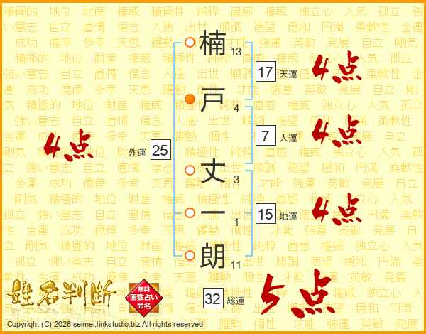 楠(13画)戸(4画) 丈(3画)一(1画)朗(11画)