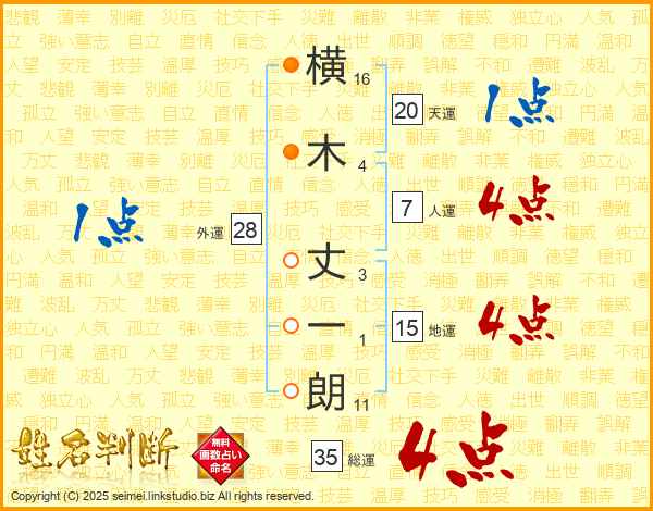 横(16画)木(4画) 丈(3画)一(1画)朗(11画)