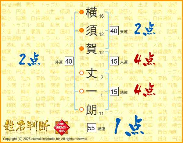 横(16画)須(12画)賀(12画) 丈(3画)一(1画)朗(11画)