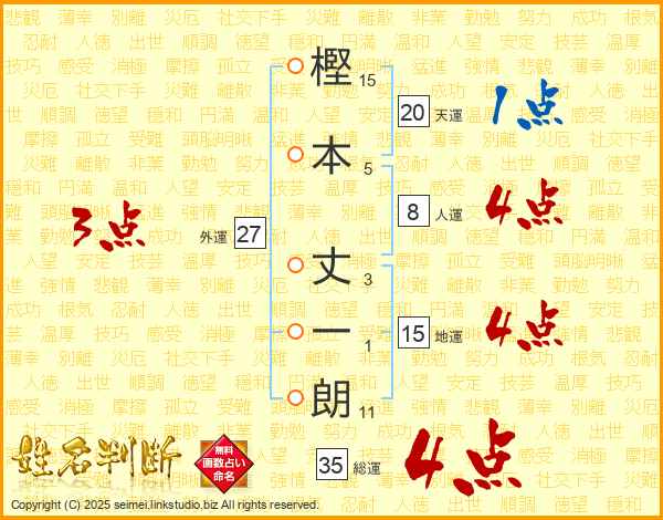 樫(15画)本(5画) 丈(3画)一(1画)朗(11画)