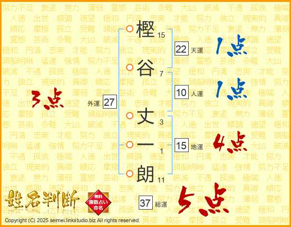 樫(15画)谷(7画) 丈(3画)一(1画)朗(11画)
