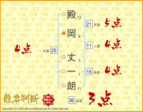 殿(13画)岡(8画) 丈(3画)一(1画)朗(11画)