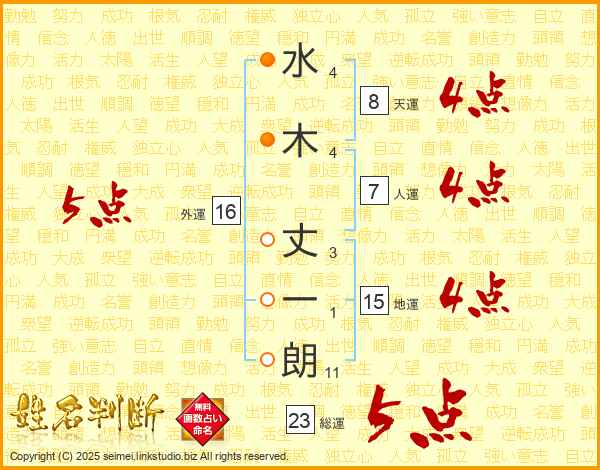 水(4画)木(4画) 丈(3画)一(1画)朗(11画)