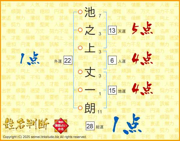 生活面を象徴する運勢です。外部から受ける影響力を表し、結婚運、家庭運や職場、環境への順応性を表します。総運から人運を引いた画数。姓や名が1文字の場合を除く。