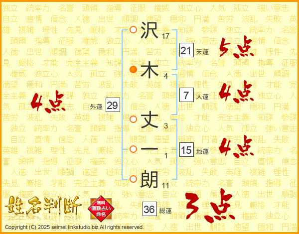 沢(17画)木(4画) 丈(3画)一(1画)朗(11画)