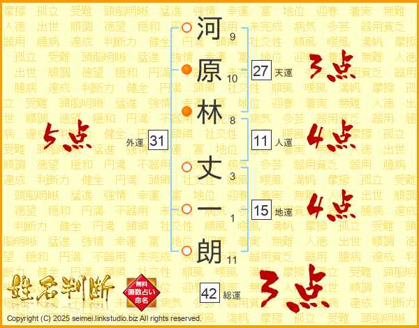 河(9画)原(10画)林(8画) 丈(3画)一(1画)朗(11画)