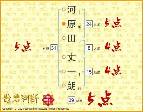 河(9画)原(10画)田(5画) 丈(3画)一(1画)朗(11画)