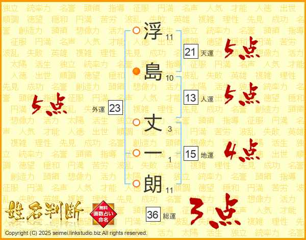 浮(11画)島(10画) 丈(3画)一(1画)朗(11画)