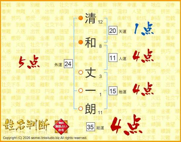 生活面を象徴する運勢です。外部から受ける影響力を表し、結婚運、家庭運や職場、環境への順応性を表します。総運から人運を引いた画数。姓や名が1文字の場合を除く。