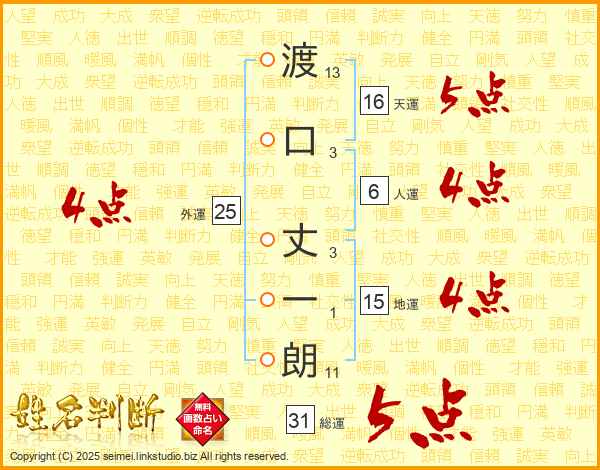 渡(13画)口(3画) 丈(3画)一(1画)朗(11画)