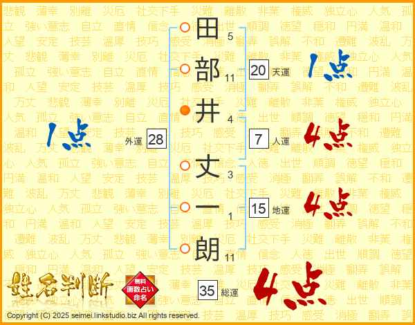 田(5画)部(11画)井(4画) 丈(3画)一(1画)朗(11画)