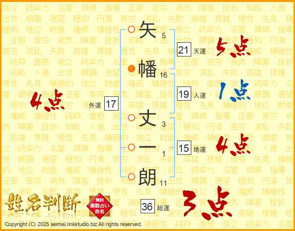 矢(5画)幡(16画) 丈(3画)一(1画)朗(11画)