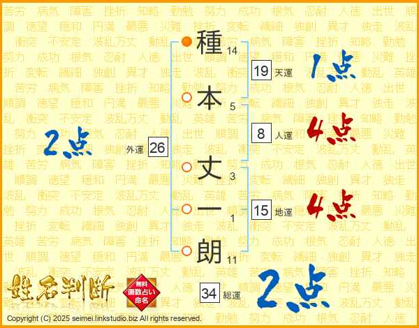 種(14画)本(5画) 丈(3画)一(1画)朗(11画)