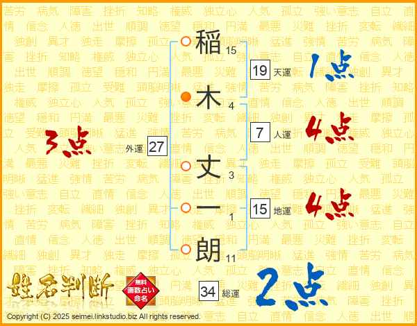 稲(15画)木(4画) 丈(3画)一(1画)朗(11画)