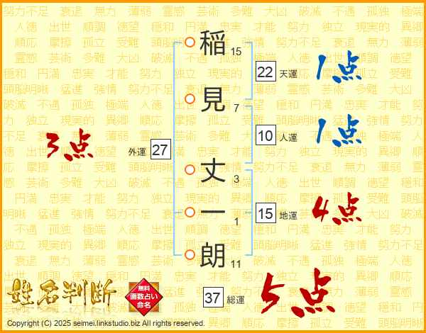 稲(15画)見(7画) 丈(3画)一(1画)朗(11画)