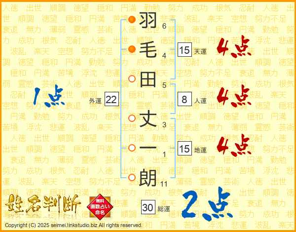 羽(6画)毛(4画)田(5画) 丈(3画)一(1画)朗(11画)