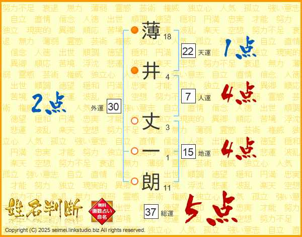 薄井丈一朗さんの総運は37画の5点!
