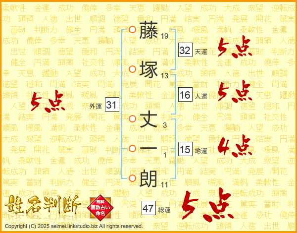 藤(19画)塚(13画) 丈(3画)一(1画)朗(11画)