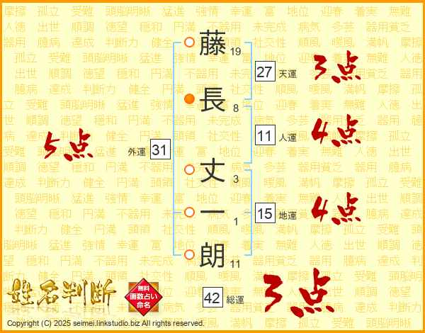 藤(19画)長(8画) 丈(3画)一(1画)朗(11画)
