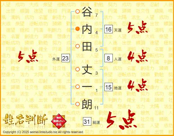 谷(7画)内(4画)田(5画) 丈(3画)一(1画)朗(11画)