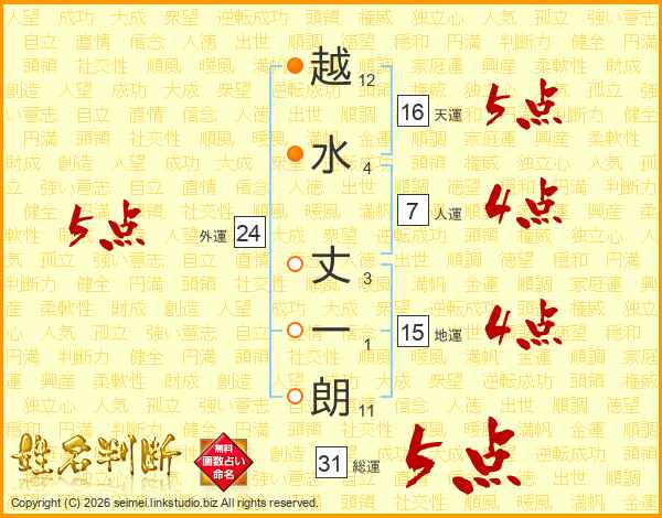 越(12画)水(4画) 丈(3画)一(1画)朗(11画)