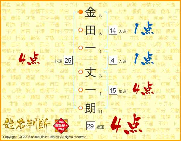 金(8画)田(5画)一(1画) 丈(3画)一(1画)朗(11画)
