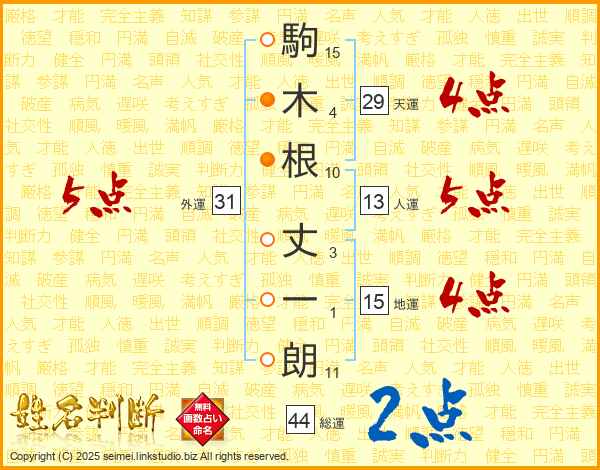 駒(15画)木(4画)根(10画) 丈(3画)一(1画)朗(11画)