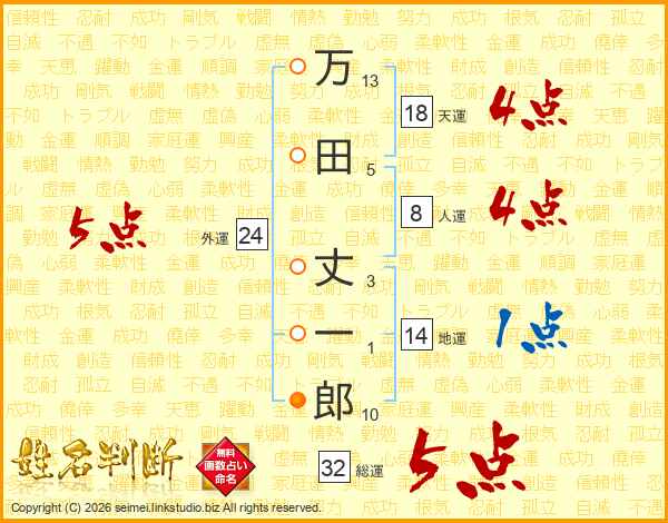 万(13画)田(5画) 丈(3画)一(1画)郎(10画)