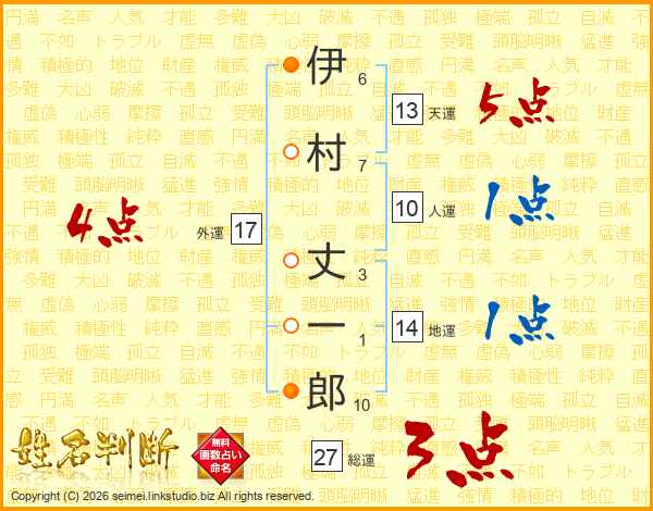 伊(6画)村(7画) 丈(3画)一(1画)郎(10画)