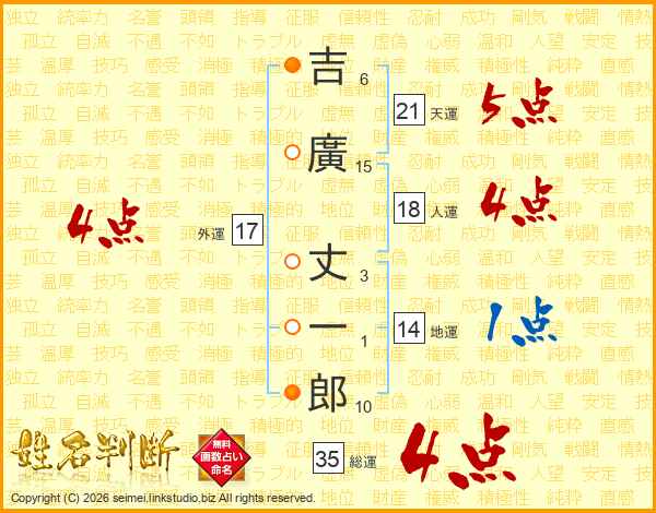 吉(6画)廣(15画) 丈(3画)一(1画)郎(10画)