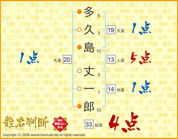 多(6画)久(3画)島(10画) 丈(3画)一(1画)郎(10画)