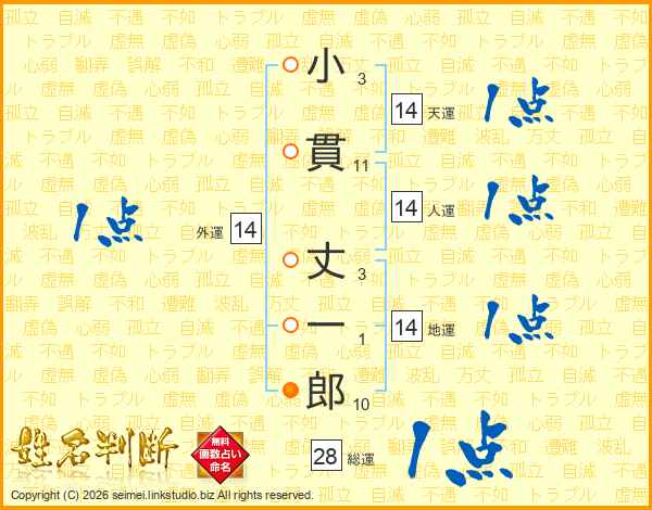 小(3画)貫(11画) 丈(3画)一(1画)郎(10画)