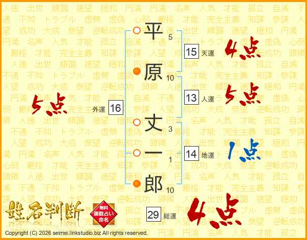 あなたの人生を表す1番重要な運勢です。生涯を通じて影響する総合運となり、主に50歳以降の晩年期に影響を及ぼします。苗字と名前の合計画数。