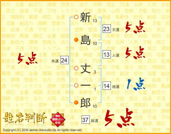 新(13画)島(10画) 丈(3画)一(1画)郎(10画)