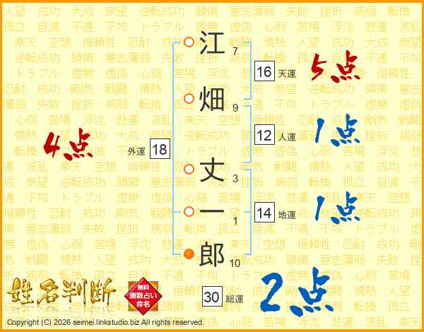 江(7画)畑(9画) 丈(3画)一(1画)郎(10画)