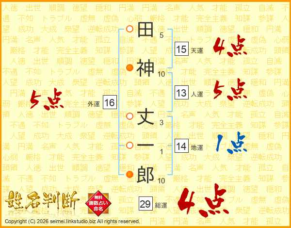 田(5画)神(10画) 丈(3画)一(1画)郎(10画)