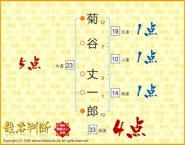 菊(12画)谷(7画) 丈(3画)一(1画)郎(10画)