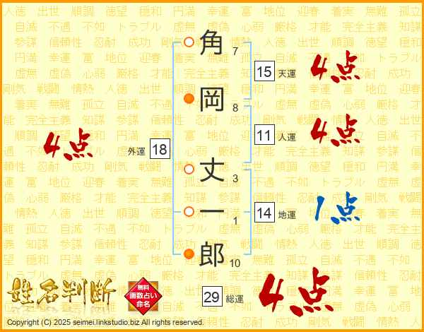 角(7画)岡(8画) 丈(3画)一(1画)郎(10画)