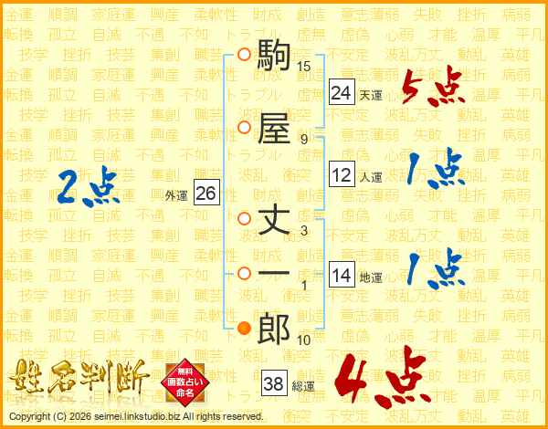 駒屋丈一郎さんの総運は38画の4点!