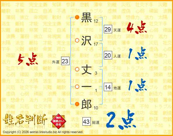 黒(12画)沢(17画) 丈(3画)一(1画)郎(10画)