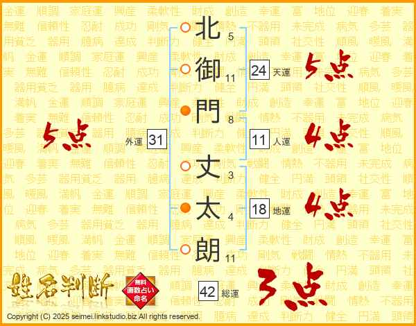 北(5画)御(11画)門(8画) 丈(3画)太(4画)朗(11画)