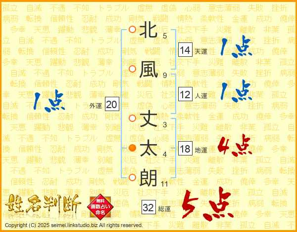 北(5画)風(9画) 丈(3画)太(4画)朗(11画)