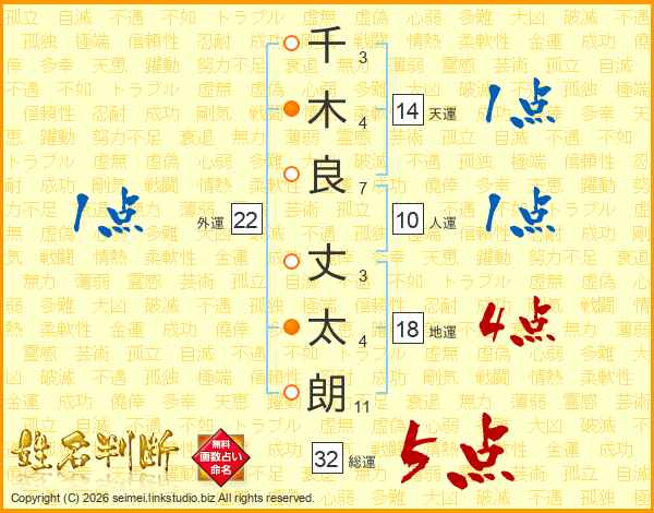 千(3画)木(4画)良(7画) 丈(3画)太(4画)朗(11画)