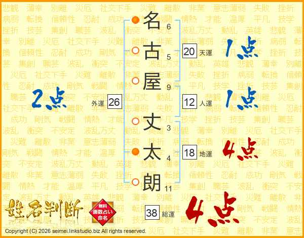 名(6画)古(5画)屋(9画) 丈(3画)太(4画)朗(11画)