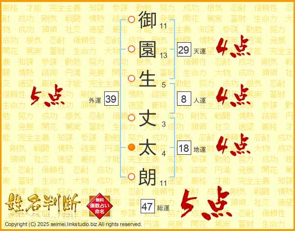 御(11画)園(13画)生(5画) 丈(3画)太(4画)朗(11画)
