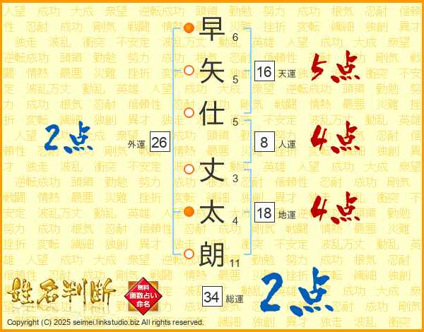 早(6画)矢(5画)仕(5画) 丈(3画)太(4画)朗(11画)